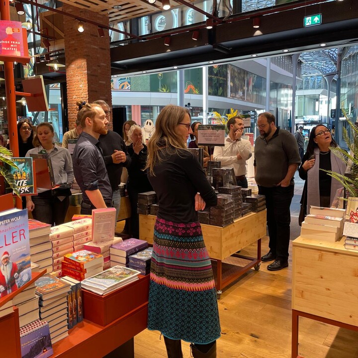 Der zweite Tag begann mit einer persönlichen Führung durch das neue Thalia-Flaggschiff im Westfield Überseequartier – ein Ort, der eindrucksvoll zeigt, wie sich stationärer Buchhandel neu erfindet: mit architektonischer Klarheit, digitalen Services und mutigen Sortimentsideen. Es folgten Einblicke in Thalias strategische Ausrichtung sowie ein Besuch bei der Verlagsgruppe Oetinger, wo Business Intelligence, Datenanalyse und digitale Prozesse greifbar wurden.